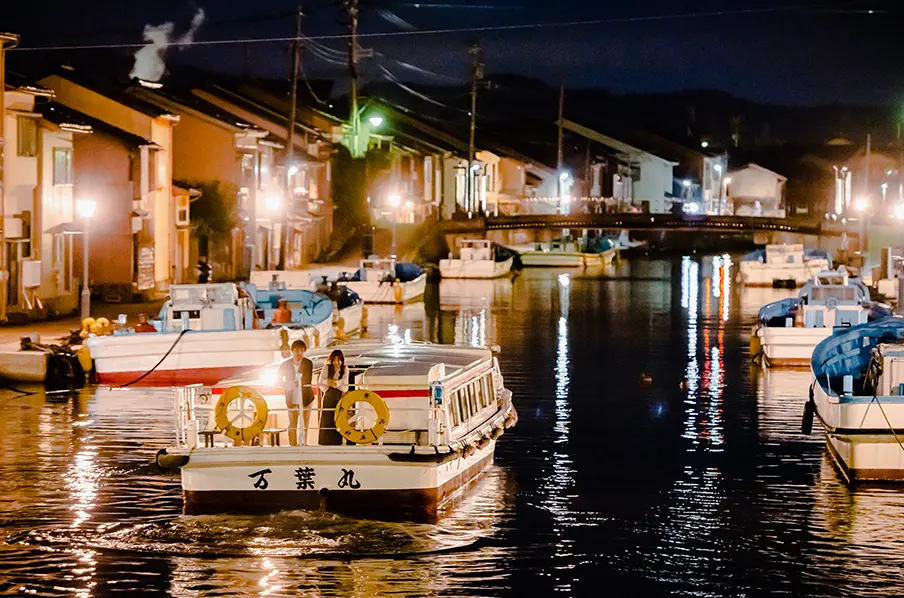 川の駅新湊を発着する新湊観光船のナイトクルーズでは、昼間とはまったく違う幻想的な港町の景色を楽しむことができます。内川沿いには、橋や家並みに灯るやさしい夜の灯りが広がり、静かな水辺の風景が訪れる人の心を癒してくれます。内川を抜けると船は海王丸パークへ。ライトアップされた帆船海王丸の美しい姿を海上から眺めることができ、夜空と海面に映る光がロマンチックな景観をつくり出します。約1時間のクルーズ。幻想的な夜のベイエリアや内川を、船の上から体験してみませんか。