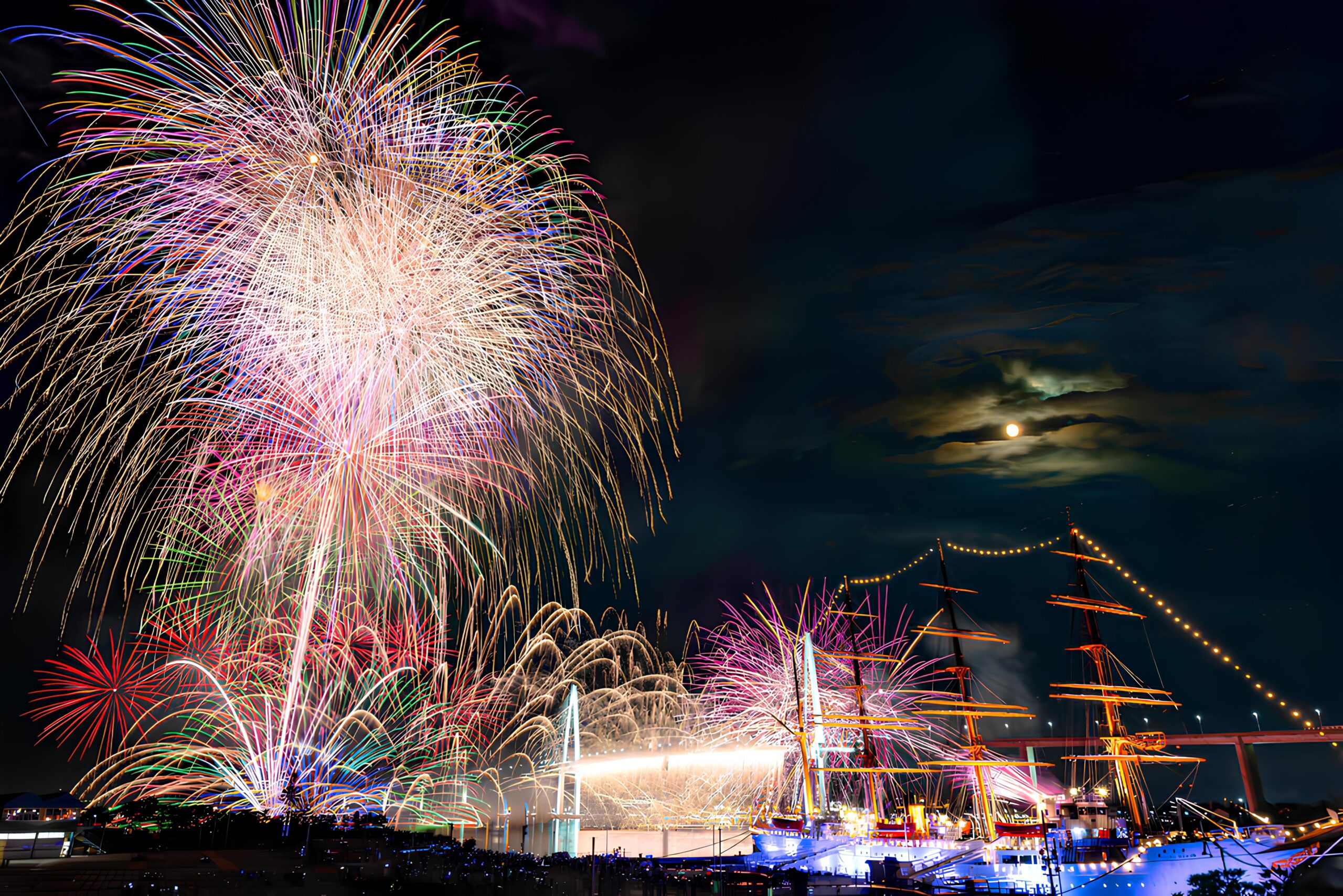 帆船海王丸のバックに海面に半円の花開く水中スターマインや新湊大橋を使った落差世界一のナイアガラ花火など、当花火大会ならではの海王丸や新湊大橋と共演する色鮮やかな花火をお楽しみください。