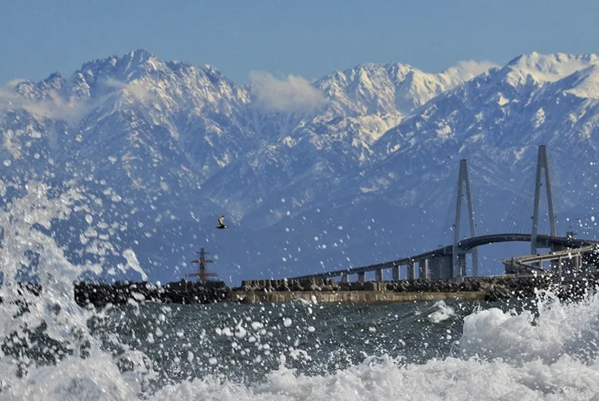 海と立山連峰が織りなす景色を満喫できる射水市。立山連峰を背に海の貴婦人・帆船 海王丸と白く美しい新湊大橋をのぞむ光景は射水市ならではの絶景です。