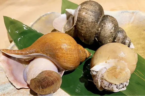 小さなツバイや、殻が大きくて薄く、しっかりとした歯ごたえのオオエッチュウバイなど様々なバイが水揚げされます。夏場の魚の漁獲が少ない時期に多く水揚げされることからも人気があり、煮付けや、近年ではツバイを用いた炊き込みご飯が人気です。刺身は漁場が近いため、臭みがなく特におすすめです。
