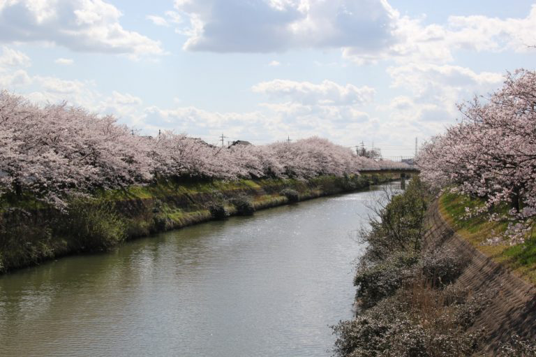 約2.7kmの両岸に、春はソメイヨシノが咲き誇り、見事な桜並木となっています。