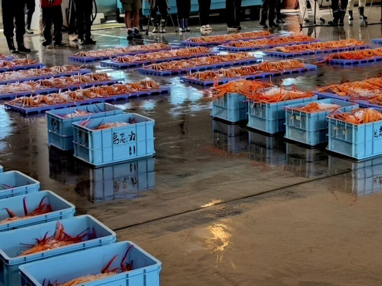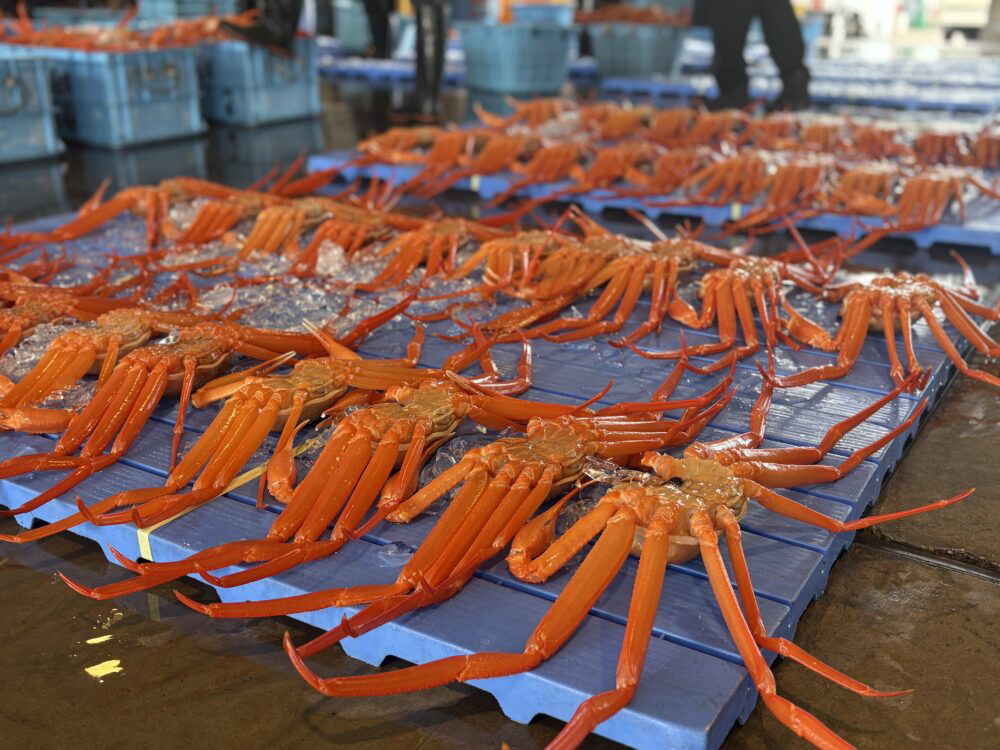 従来までの床一面にカニが並ぶ”真っ赤な絨毯”の光景とは異なりますが、港と漁場が近いという地の利点を生かし、セリ人と買い手の真剣なやりとりを身近に見ることができる昼セリ見学をこれからもお楽しみいただきますよう、お願いいたします。