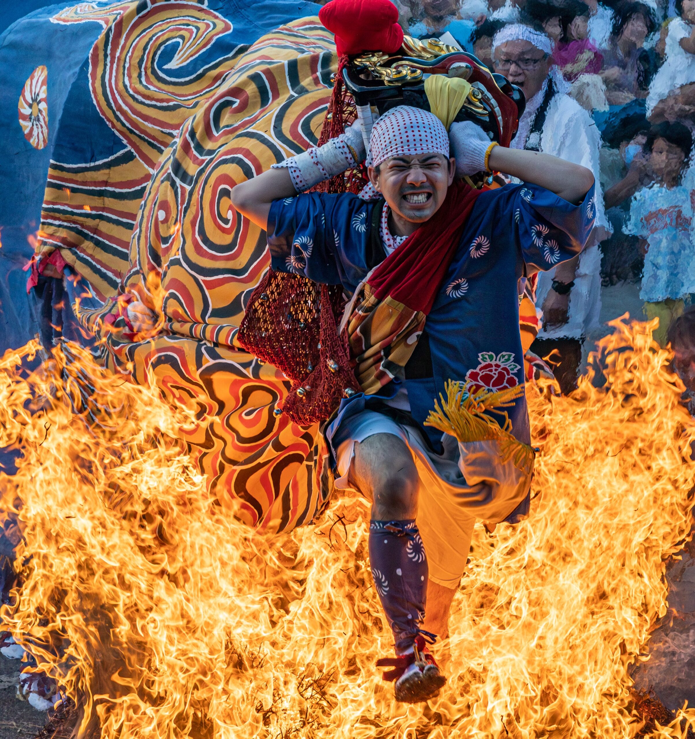 氏子の家々を一巡して、けがれを集め、わらを燃やした炎の中を駆け抜けて、けがれを焼き払うという、不動明王信仰に基づく神仏混交のもので、山伏によって伝えられたと言われています。