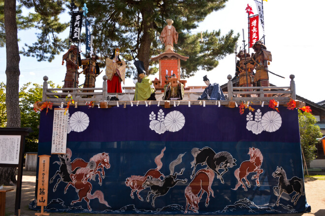10月2日の未明になると、境内に祭壇の飾り付けが始まり、毎年地域ゆかりの歴史や人物をテーマとした人形が祭壇に飾られます。日が沈む前に飾り人形を片付けないと神が怒るとの伝承があり、飾り付けられた人形は日中だけ展示され、その日の夕方になると速やかに片付けられます。
