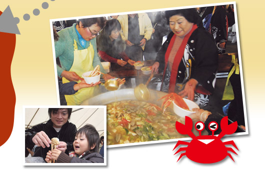| やっと会えたね!今日は新湊でおまつりがあるみたいで、人がいっぱい来てるよ!あっという間の射水の海の旅だったけど楽しかったなぁ。みんなにはカニのいろんな料理でぼくたちのおいしさを分かってもらえるといいな。見どころいっぱいの射水にみんなで遊びにおいでよ! | ||