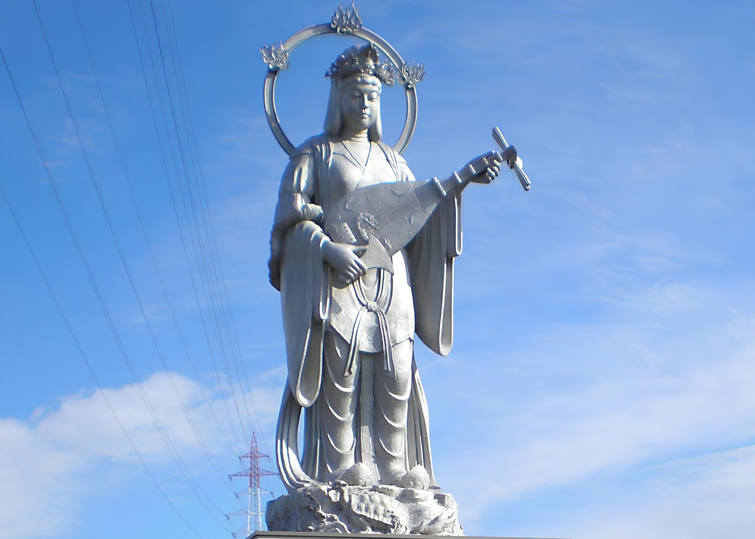 富山新港近くに造成された港の見える緑地帯に、美しい弁財天が静かに立っています。放生津潟にあった弁天島の少童社の祭神を胎内神として納め、平和と港の守護の願いを込めて建立されたものです。