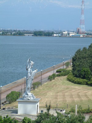 また、同じ場所に高さは19.5mの展望台があります。富山新港開港10周年を記念し、昭和55年に建立されました。そこからは、富山新港湾内と射水平野を望むことができます。