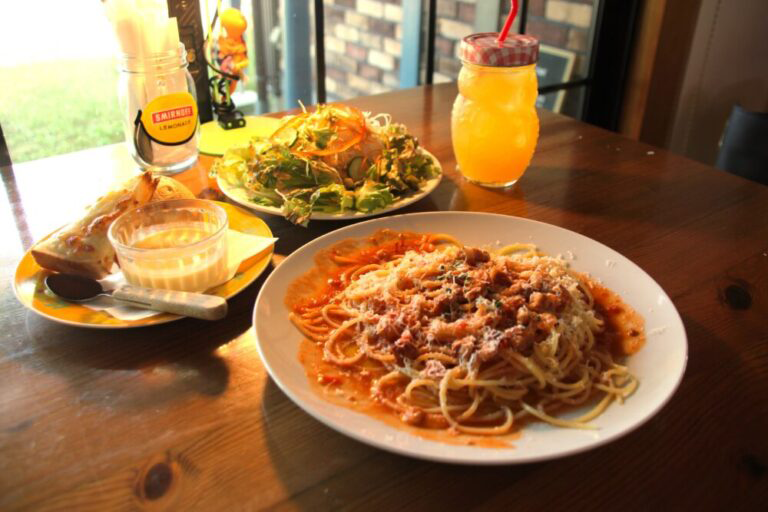 たっぷりのサラダ、本日のパスタ、スープ、パン、コーヒー
