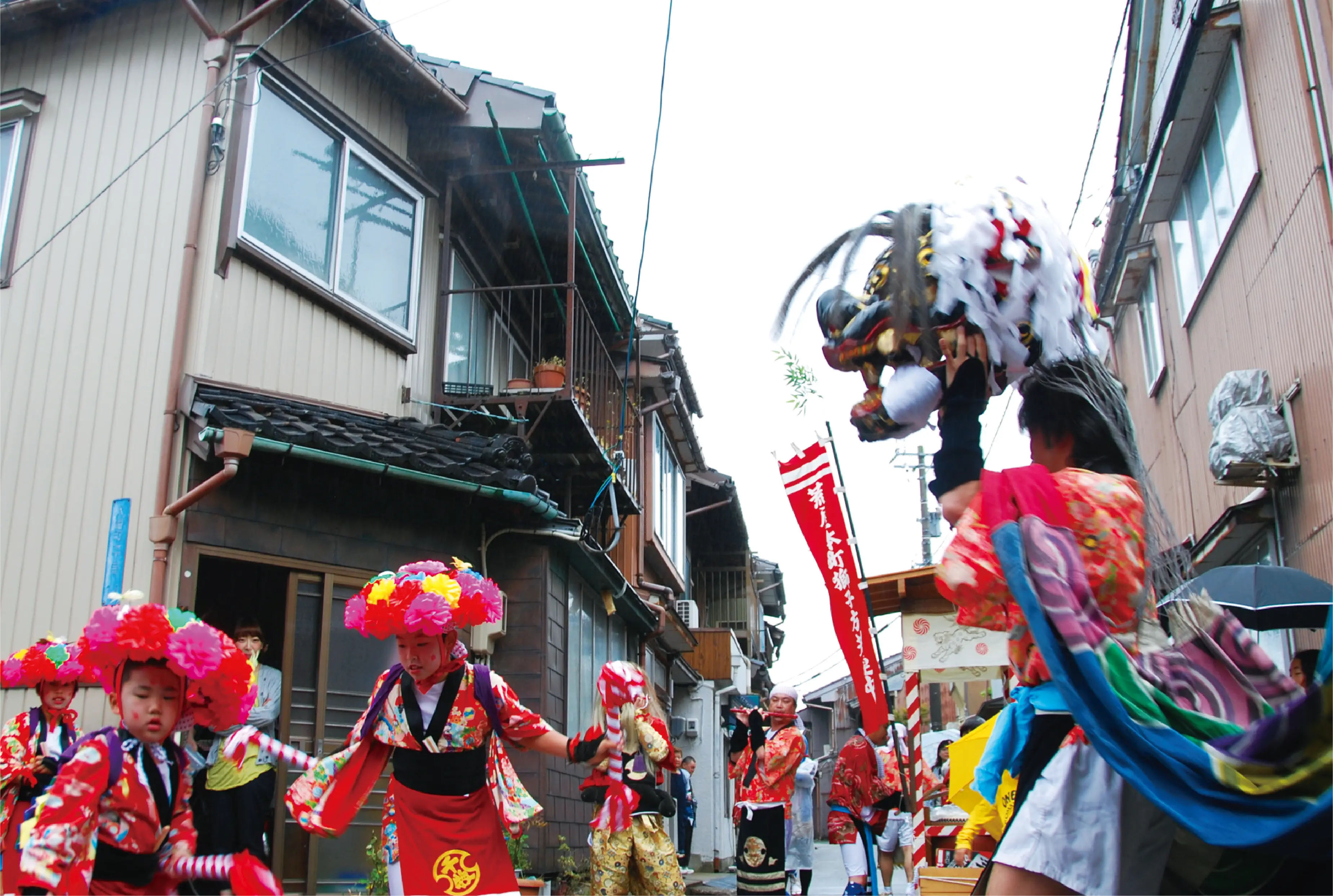 愛嬌たっぷりの顔でゆさゆさと舞う獅子と、色鮮やかな衣装で舞う子どもや若衆たち、心地よく響くお囃子の音…。獅子舞の日は、まち全体が浮き足立ち、喜びに包まれる日。獅子舞のある地区が密集しており、祭礼の日も重なっているため、いくつもの幸せな光景に出会えます。
