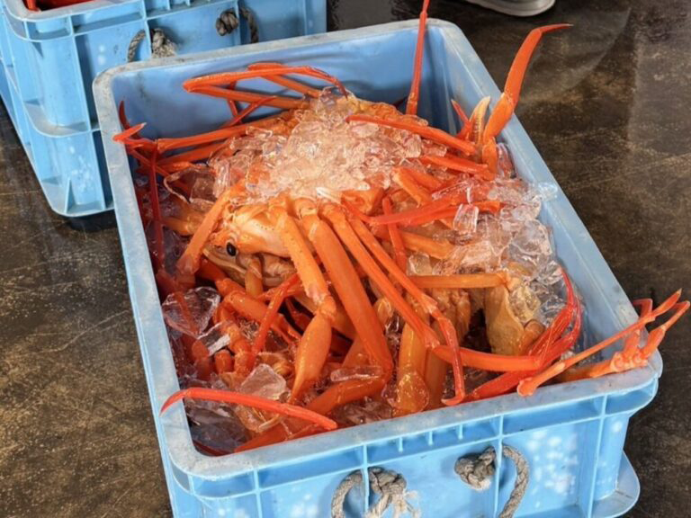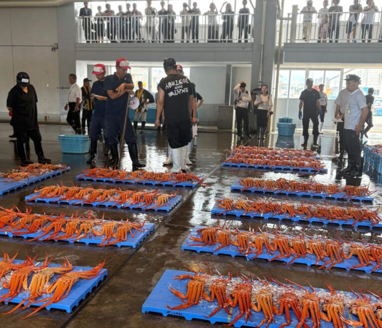 従来までの床一面にカニが並ぶ”真っ赤な絨毯”の光景とは異なりますが、港と漁場が近いという地の利点を生かし、セリ人と買い手の真剣なやりとりを身近に見ることができる昼セリ見学をこれからもお楽しみいただきますよう、お願いいたします。