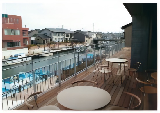 2階のデッキに立ち、内川を眺めると、川風がゆったりと心地よく感じられます。ここは内川散策の拠点となる「川の駅新湊」です。