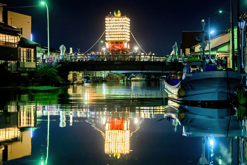 射水の代表的なお祭りといえば、曳山祭。昼は勇壮な花山、夜は提灯山に彩られ幻想的な姿で町内を曳き廻します。