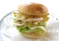 シロエビのかき揚げを豪快にサンドしたご当地バーガー。香ばしさとジューシーさがパンに絶妙にマッチします。