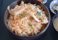 カラッと揚がったシロエビのかき揚げを丼いっぱいにのせた一品。香ばしさと甘みが際立ち、ご飯との相性抜群です。
