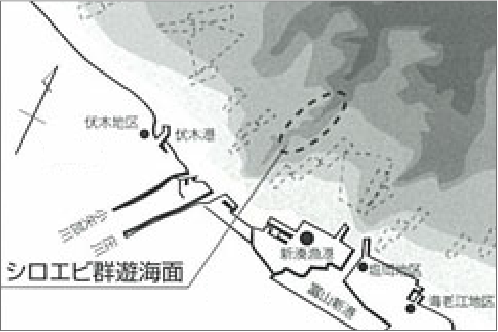 シロエビは、富山湾だけでなく駿河湾や相模湾など、日本全国の海域に広く分布しています。しかし、漁業が成り立つ程漁獲されるのは富山湾の、射水市新湊沖、富山市沖だけです。いずれも大きな河川の河口部の沖合いで、河川が刻んだ深く切れ込んだ海域です。水深 100〜600mの深海に生息するシロエビにとって格好の住処となっているのです。